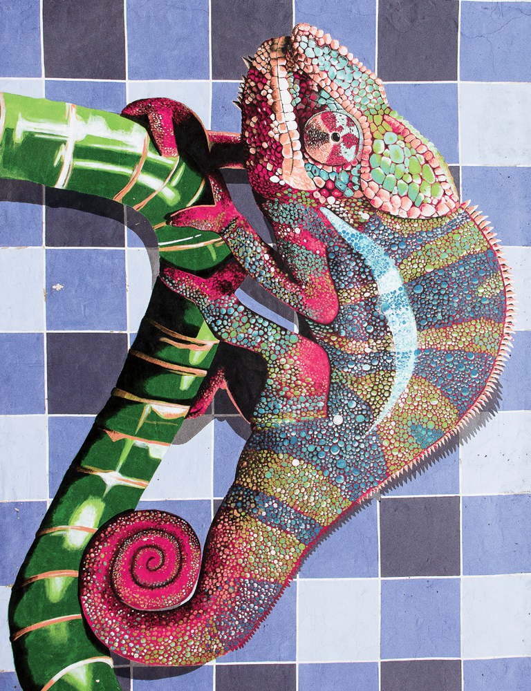 Arte de tapa: Camaleón. Mural ubicado en la esquina de España y Malnatti en San Miguel.